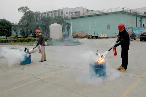 演练前,相关安全技术人员向参演人员介绍了包括干粉灭火器、二氧化碳灭火器及水基型灭火器在内的多种灭火器材的基本原理、应用范围及操作方法,并现场进行灭火示范,同时讲解了发生火灾时的正确逃生方法。随着一声令下,参演人员手持各种类型的灭火器,对两个正在燃烧着的铁桶进行灭火。演练中,参演人员操作有序、动作规范,顺利完成灭火任务,演练取得预期效果。