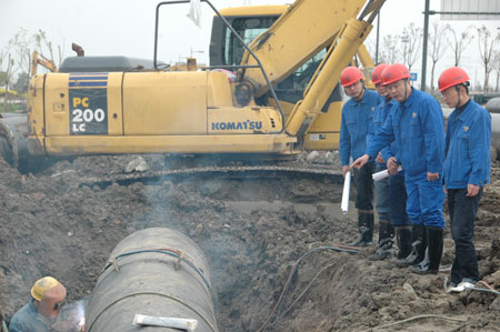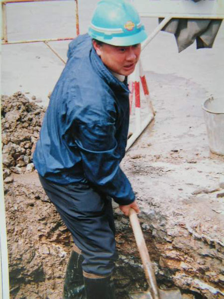 阀门终于关上了,大水控制住了,接下来是清除破损的水管,然后接管、打麻、塞水泥......盛夏季节,黑色马路上难耐的高温,烤得人头昏脑zhang,周松庆和队员们早已经汗流浃背,精疲力竭。工程正在紧张地进行,大家心里默念着,就早一分钟完工通水,就让用户少一分麻烦。
