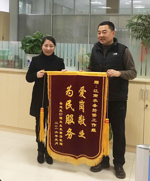“等等,我还不知道你们的名字呢。”第2天一大早,袁女士便带着锦旗,送来了她对抢修队员的感谢。