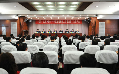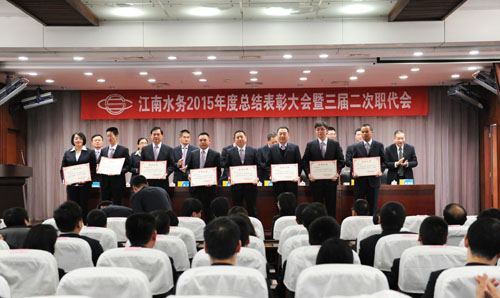 19日,公司在14楼会议室召开2015年度总结表彰大会暨三届二次职代会。公司党委书记、董事长龚国贤作讲话,总经理沙建新作题为《新起点 新征程 创新实干实现水务事业新跨越》的2015年度总结报告,并详细部署2016年度工作,明确各项目标任务。会议由副总经理高立主持。