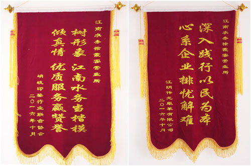 心系企业,赢得赞誉。10月7日,峭岐印染行业联合协会和伟龙服装公司送来锦旗,感谢公司主动作为、服务企业,将峭璜路管道与长山大道主管道连接,使峭岐区域形成环状供水网,有效提升了水压、水量,保障了用水需求,为企业发展提供了支撑。