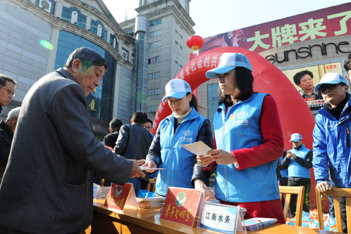 3月15日,在学院广场。公司客服中心、澄中供水公司工作人员正热情地向来往市民解答涉水疑问,解读服务承诺,宣传节约用水理念。