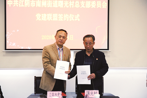 11月24日,公司与江阴市南闸街道曙光村举行“党建联盟”签约仪式。南闸街道党工委书记李志浩、副书记蔡晓华、纪工委书记张琼、组织委员蒋峰、曙光村党总支部书记金顺才,公司董事长、总经理华锋,党委书记龚国贤,副总经理高立,以及双方党员先锋队、志愿服务队代表参加签约仪式。